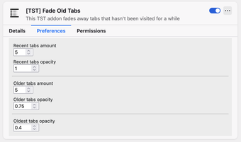 TST Fade Old Tabs เป็นส่วนเสริมของ Firefox ที่ออกแบบมาเพื่อปรับปรุงการจัดระเบียบแท็บโดยการทำให้แท็บที่ไม่ใช้งานจางลง เครื่องมือการปรับแต่งนี้จัดกลุ่มแท็บออกเป็นสามกลุ่มที่แตกต่างกันตามเวลาที่เข้าถึงล่าสุด: 'recent', 'older', และ 'oldest' แต่ละกลุ่มจะได้รับระดับความทึบที่แตกต่างกัน ทำให้ผู้ใช้สามารถระบุได้อย่างง่ายดายว่าแท็บใดที่ต้องการความสนใจและแท็บใดที่สามารถละเลยได้ชั่วคราว การแยกแยะทางสายตานี้ช่วยทำให้ประสบการณ์การท่องเว็บมีประสิทธิภาพมากขึ้น